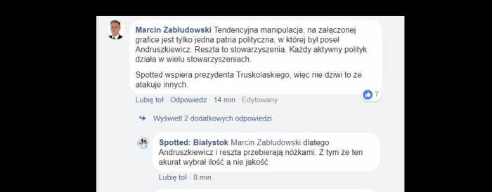 Komentarz tradycyjnie został szybko usunięty, a Marcin Zabłudowski zablokowany, tak jak wiele innych osób, które wypowiadały się w tym samym tonie. Być może nie wszyscy jeszcze wiedzą, ale ze spotted bialystok związana jest niejako radna Anna Augustyn, szefowa klubu radnych Komitetu Tadeusza Truskolaskiego. Jej mąż – Karol Augustyn – obsługuje ten profil w charakterze podmiotu odpowiedzialnego za reklamy. Z nim wcześniej związany był także zastępca Tadeusza Truskolaskiego – Rafał Rudnicki, który zanim trafił do urzędu, był też wspólnikiem Karola Augustyna w prowadzonej wspólnie firmie.