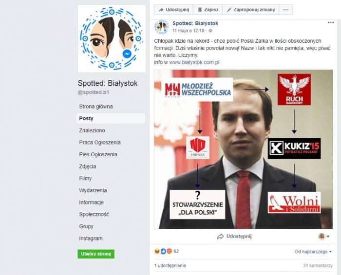 Teraz spotted zabrało się już za „jazdę” po Jacku Żalku, kandydacie Zjednoczonej Prawicy na prezydenta Białegostoku. To w sumie nic nowego, bo o tej formacji na spotted nic dobrego się przeczytać nie da. Poseł Żalek swoim zachowaniem też nie pomaga, aby takich sytuacji unikać. Niemniej w ostatnich dniach oberwało się także Adamowi Andruszkiewiczowi, posłowi koła Wolni i Solidarni. Jego przewinieniem jest to, że miał czelność powołać do życia stowarzyszenie.