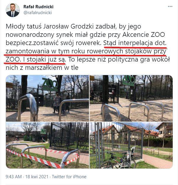 „Młody tatuś Jarosław Grodzki zadbał, by jego nowonarodzony synek miał gdzie przy Akcencie ZOO bezpiecz.zostawić swój rowerek. Stąd interpelacja dot. zamontowania w tym roku rowerowych stojaków przy ZOO. I stojaki już są. To lepsze niż polityczna gra wokół nich z marszałkiem w tle” – napisał na swoim profilu na Twitterze zastępca prezydenta Rafał Rudnicki.
