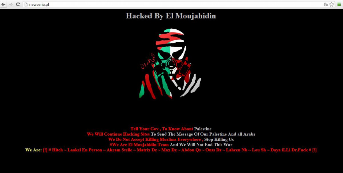 „Powiedzcie swojemu rządowi, niech wie o Palestynie. Będziemy kontynuować hakowanie stron internetowych, aby wiadomość dotarła do naszej Palestyny i wszystkich Arabów. Nie akceptujemy zabijania Arabów wszędzie. Przestańcie nas zabijać. Jesteśmy drużyną El Moujahidin i nie zaprzestaniemy wojny” – brzmi komunikat na zaatakowanej stronie.