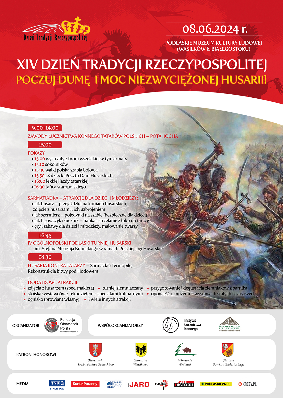 W sobotę, 8 czerwca 2024 r., w Podlaskim Muzeum Kultury Ludowej w Wasilkowie odbędzie się XIV edycja Dnia Tradycji Rzeczpospolitej. Impreza jest zaplanowana na cały dzień! Wstęp wolny.