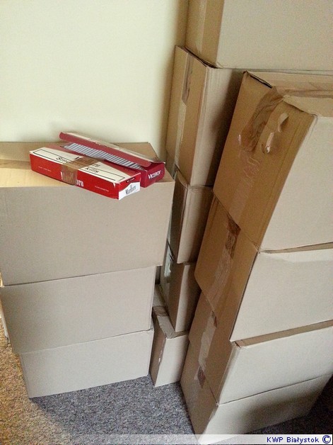 W poniedziałek tuż po godzinie 14.30 policjanci z Wydziału do walki z Przestępczością Gospodarczą Komendy Miejskiej Policji w Białymstoku współpracując z funkcjonariuszami z Placówki Straży Granicznej w Bobrowniach przeszukali wynajmowany na jednym z białostockich osiedli garaż. Z informacji mundurowych wynikało, że 48-letni mieszkaniec powiatu białostockiego – najemca pomieszczenia, przechowuje tam papierosy bez polskich znaków skarbowych akcyzy. Informacja się potwierdziła.