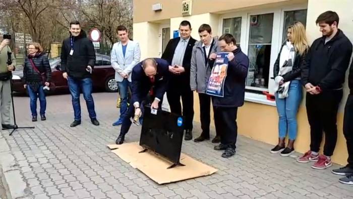I już chwilę później po tych słowach, tłukł młotkiem telewizor pod samą siedzibą Telewizji Polskiej, oddziału w Białymstoku. Rozbicie tego telewizora miało charakter symboliczny, ale jednocześnie miało też zwrócić uwagę innych mediów, aby nie ignorowały mniejszych formacji, które tak samo, jak te duże, mają swoją ofertę programową skierowaną do Polaków.
