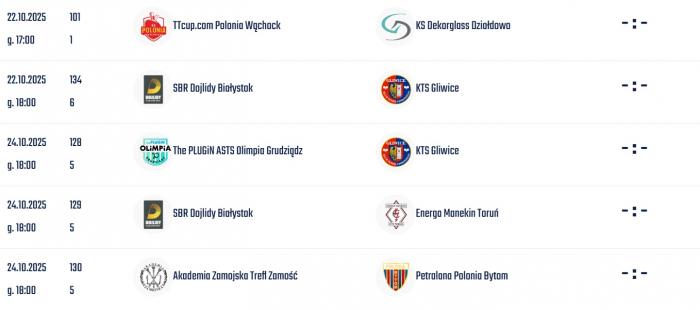 Dla SBR Dojlidy mecz z Gliwicami ma kluczowe znaczenie. Początek sezonu był dla białostoczan trudny: po emocjonującym zwycięstwie 3:2 w pierwszej kolejce z Olimpią Grudziądz, nastąpiła seria trzech porażek, która dała drużynie tylko jeden punkt. Kapitan Patryk Chojnowski i Piotr Chodorski będą musieli zmierzyć się z rywalem, w którego szeregach najlepiej punktuje Grzegorz Felkel (trzy zwycięstwa, m.in. z Wang Zeng Yim).