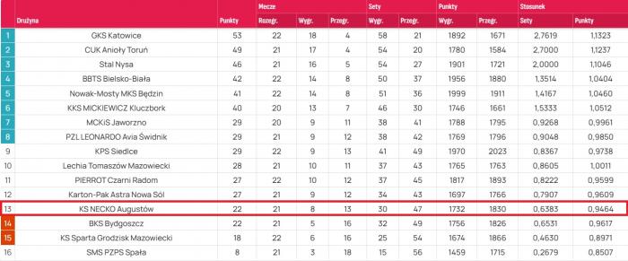 Zwycięstwo za dwa punkty pozwoliło siatkarzom z Augustowa awansować w tabeli PLS 1. Ligi z 14. na 13. miejsce, co oznacza opuszczenie strefy spadkowej. Obecnie Necko ma na koncie 22 punkty i z optymizmem patrzy w przyszłość, choć kalendarz nie rozpieszcza zawodników z grodu nad Nettą.