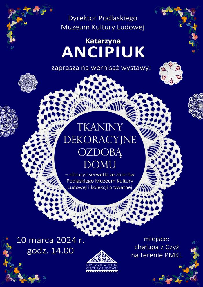 Nowa wystawa czasowa w Podlaskim Muzeum Kultury Ludowej, zatytułowana „Tkaniny dekoracyjne ozdobą domu”! Autorką jest Katarzyna Ancipiuk – dyrektor Podlaskiego Muzeum Kultury Ludowej. W zabytkowej chałupie z Czyż można będzie zobaczyć kilkadziesiąt serwetek i obrusów ze zbiorów muzeum i kolekcji prywatnej. Wernisaż w niedzielę, 10 marca o godzinie 14.00. W trakcie wydarzenia hafciarka Elżbieta Wityk poprowadzi warsztaty.