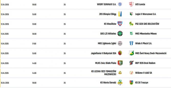 Pozostałe wyniki 25. kolejki: RKP 1926 Broń Radom - Lechia 1923 Tomaszów Mazowiecki 2:3, PGE GiEK GKS Bełchatów - Mławianka Mława 0:1, Legia II Warszawa - Warta Sieradz 1:1, Świt Nowy Dwór Mazowiecki - Olimpia Elbląg 0:1, Widzew II Łódź - Znicz Biała Piska 2:3.