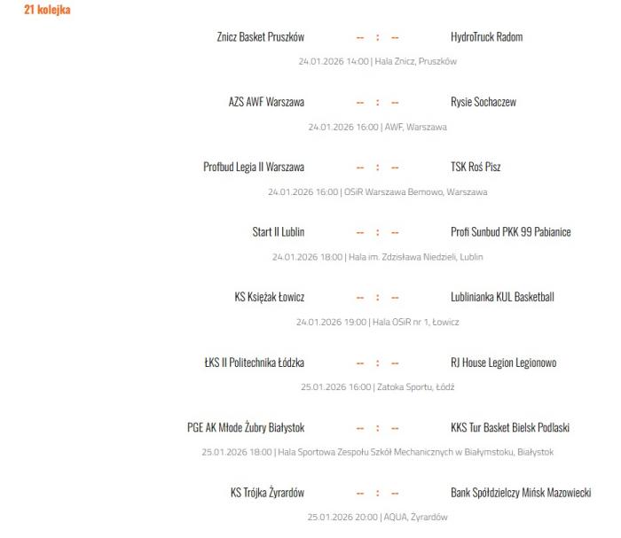 Wyniki 20. kolejki: HydroTruck Radom - AZS AWF Warszawa 94:87, Trójka Żyrardów - Znicz Basket Pruszków 65:79, ŁKS II Politechnika Łódzka - Profi Sunbud PKK 99 Pabianice 79:74, RJ House Legion Legionowo - Profbud Legia II Warszawa 116:75, Lublinianka KUL Basketball - Start II Lublin 79:70. Mecze Rysie Sochaczew - Księżak Łowicz - 28 stycznia, PGE Młode Żubry Białystok - TSK Roś Pisz - 25 lutego.