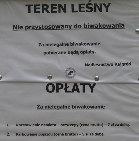 Kryzys mija najwyraźniej, bo każdy zarabia na czym tylko się da. Nawet na tym, co jest niedozwolone. Z takiego założenia przynajmniej wychodzi Nadleśnictwo Rajgród, które najpierw wywiesza karteczki, że biwakowanie jest niedozwolone, a potem podaje cennik biwakowania.