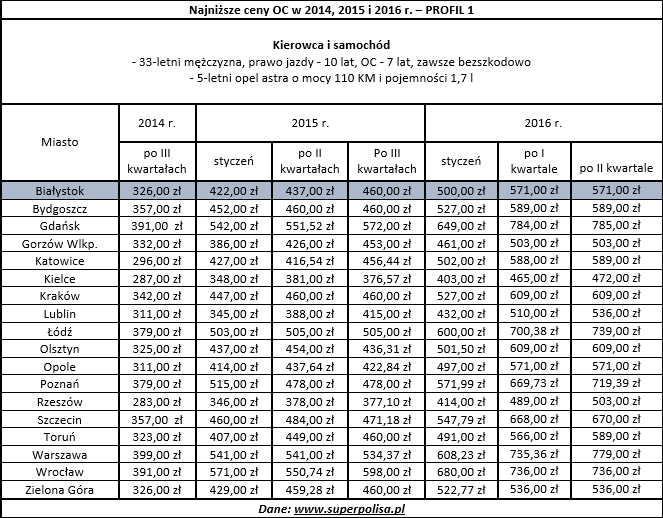Wzrost cen za obowiązkowe ubezpieczenie komunikacyjne obrazują przeprowadzone przez Superpolisę kalkulacje dla tych samych profili kierowców i samochodów w styczniu, na koniec pierwszego kwartału i po półroczu. Multiagencja ubezpieczeniowa cyklicznie monitoruje poziom składek dla 33-letniego właściciela pięcioletniego opla astry, który prawo jazdy ma od 10 lat i już siódmy rok opłaca OC (kierowca nr 1), a także dla 37-latka z prawem jazdy od 15 lat, od 10 lat wykupującego OC, który jeździ czteroletnim volkswagenem golfem (kierowca nr 2). Pierwszy z kierowców obecnie nie kupi w Białymstoku OC taniej niż za 571 zł, przy czym w styczniu kosztowałoby go zaledwie 500 zł, czyli 15% mniej niż obecnie. Ubezpieczenie podrożało także w przypadku drugiego kierowcy, który na początku roku polisę dla zarejestrowanego w stolicy Podlasia mógł kupić za 510 zł, w ubiegłym kwartale zapłaciłby aż 560 zł, a aktualnie najtańsza oferta kosztuje 586 zł – to o 15% więcej niż na początku roku. Podwyżki widać we wszystkich miastach wojewódzkich. Dla przykładu 33-letni posiadacz opla astry w Poznaniu kupi obecnie OC o 26%, a w Lublinie o 24% droższe. Natomiast 37-latek jeżdżący golfem w Krakowie za najtańszą polisę zapłaci o 27%, a w Łodzi aż o 50% więcej.