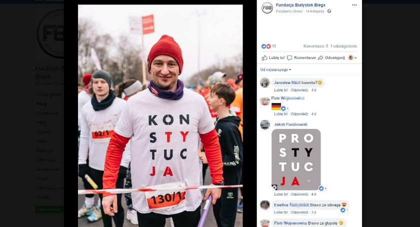 Miało być uroczyście, bo dla Polski Niepodległej. Większość zawodników w niepodległościowym biegu w Białymstoku miała na sobie koszulki z napisem „Niepodległa”, albo inne, jednak neutralne w takim dniu. Ale jeden z zawodników wyróżniał się na tle innych. W święto narodowe, postanowił nieco upolitycznić wydarzenie sportowe. Pojawił się w koszulce z napisem „Konstytucja”.