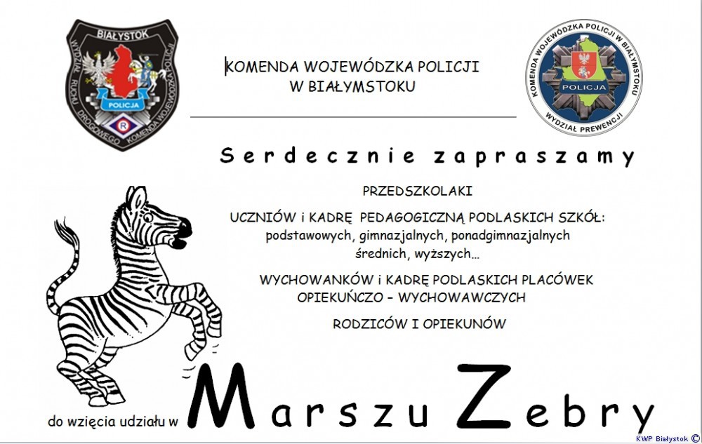 Tak będzie już 15 maja 2014 roku na placu przed Teatrem Dramatycznym im. Aleksandra Węgierki w Białymstoku (zbiórka o godz. 8:30). To właśnie stamtąd o godz. 9:00 wyruszy „Marsz Zebry” i przejdzie ulicami: Branickiego, Świętojańską, Mickiewicza - na plac przed Teatrem Dramatycznym, gdzie odbędzie się festyn z szeregiem zabaw i atrakcji oraz wspólnym przesłaniem o bezpieczne drogi.