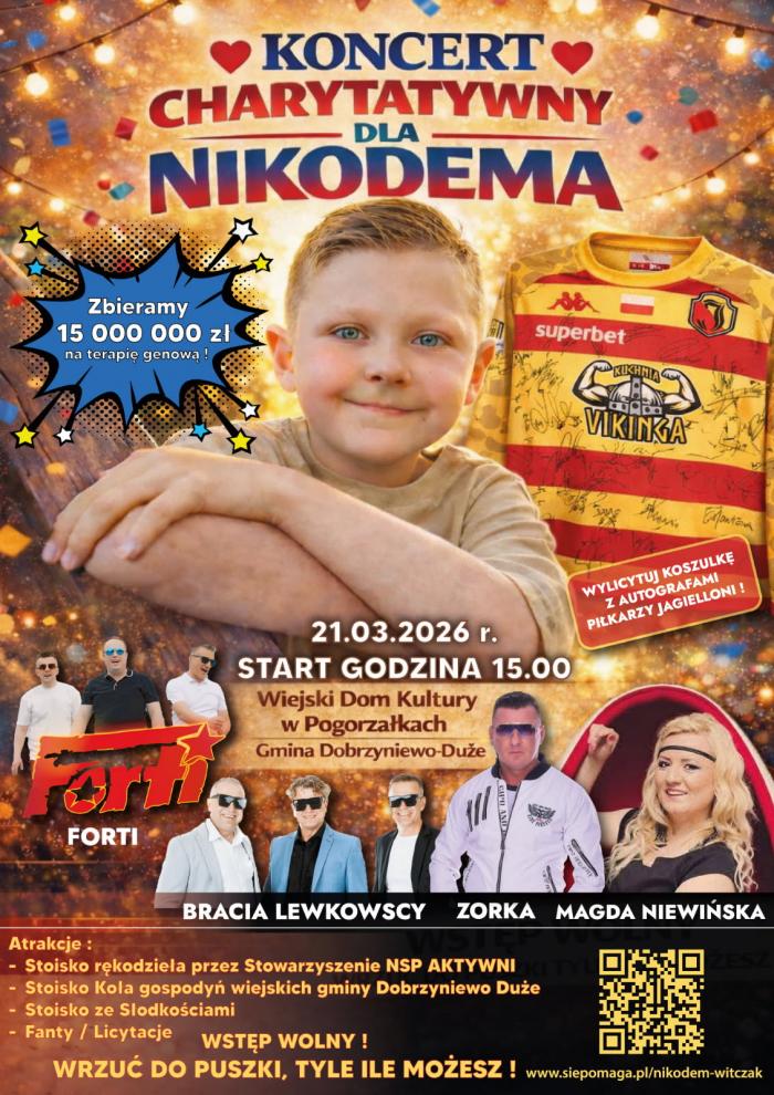 Mieszkańcy naszego regionu już wielokrotnie udowadniali, że w obliczu ludzkiej tragedii potrafią się zjednoczyć. Tym razem pomoc potrzebna jest pilnie – mały Nikodem walczy z DMD (dystrofią mięśniową). Szansą na ratunek jest niezwykle kosztowna terapia genowa w Dubaju, której koszt to niewyobrażalne 15 milionów złotych. Już w sobotę, 21 marca o godzinie 15.00 w Wiejskim Domu Kultury w Pogorzałkach odbędzie się wydarzenie, które może realnie przybliżyć chłopca do odzyskania zdrowia.