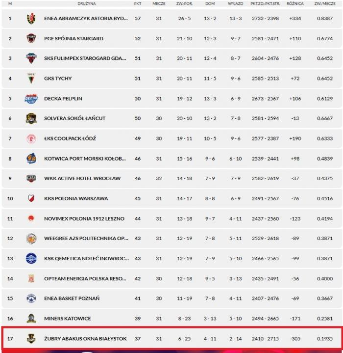 Pozostałe wyniki 32. kolejki: GKS Tychy - Weegree AZS Politechnika Opolska 96:76, Polonia Warszawa - PGE Spójnia Stargard 71:89, Decka Pelplin - WKK Active Hotel Wrocław 90:79, SKS Fulimpex Starogard Gdański - Enea Abramczyk Astoria Bydgoszcz 74:78, Novimex Polonia 1912 Leszno - Kotwica Port Morski Kołobrzeg 90:88. Mecze OPTeam Energia Polska Resovia - Enea Basket Poznań, Solvera Sokół Łańcut - ŁKS Coolpack Łódź - 12.04.