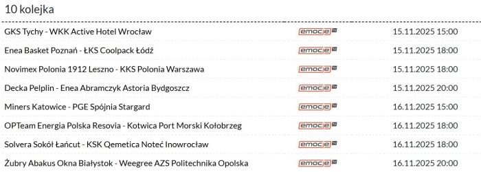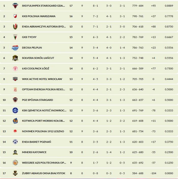 Pozostałe wyniki 9. kolejki: WKK Active Hotel Wrocław - SKS Fulimpex Starogard Gdański 71:82, Kotwica Port Morski Kołobrzeg - Enea Basket Poznań 82:64, KKS Polonia Warszawa - Solvera Sokół Łańcut 108:96, Weegree AZS Politechnika Opolska - Enea Abramczyk Astoria Bydgoszcz 81:84, KSK Qemetica Noteć Inowrocław - GKS Tychy 75:83, Novimex Polonia 1912 Leszno - Decka Pelplin 95:86, PGE Spójnia Stargard - OPTeam Energia Polska Rzeszów 83:88.