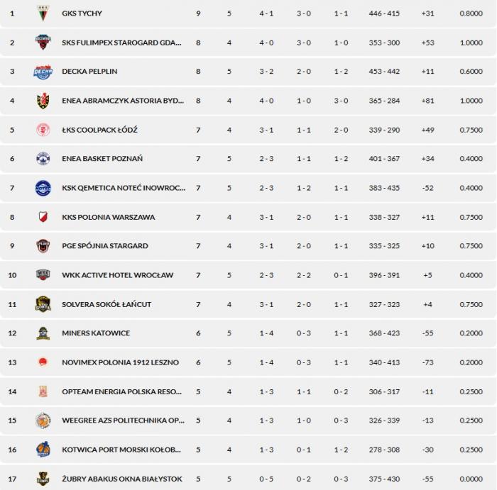 Pozostałe wyniki 5. kolejki: Novimex Polonia 1912 Leszno - Miners Katowice 51:76, PGE Spójnia Stargard - Weegree AZS Politechnika Opolska 81:73, GKS Tychy - Decka Pelplin 105:89, Kotwica Port Morski Kołobreg - ŁKS Coolpack Łódź 58:85, KSK Qemetica Noteć Inowrocław - Enea Basket Poznań 76:74. Mecze KKS Polonia Warszawa - OPTeam Energia Polska Resovia, Solvera Sokół Łańcut - SKS Fulimpiex Starogard Gdański - 12 października.