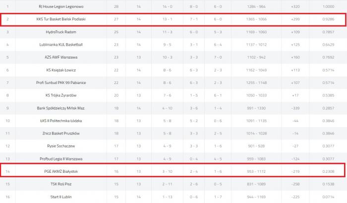 Pozostałe wyniki 14. kolejki: Księżak Łowicz - Start II Lublin 89:63, Bank Spółdzielczy Mińsk Mazowiecki - Profi Sunbud PKK 99 Pabianice 78:131, RJ House Legion Legionowo - Lublinianka KUL Basketball 75:62.