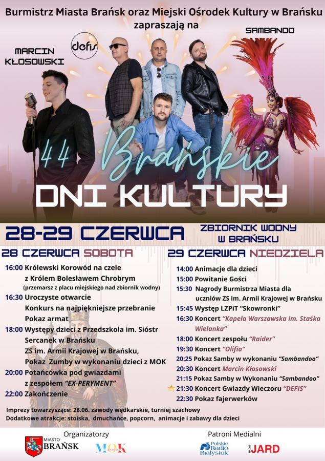 Zapraszamy na 44. Dni Brańska, które odbędą się 28-29 czerwca 2025 roku nad zbiornikiem wodnym w Brańsku. Czekają na Was barwne widowiska, konkursy, koncerty oraz wiele atrakcji, takich jak festiwalowe stoiska, animacje dla dzieci i pokazy artystyczne. Nie przegapcie tej okazji do wspólnego świętowania lokalnej kultury i tradycji! Niech te wydarzenia na zawsze pozostaną w Waszej pamięci. Do zobaczenia na 44. Dniach Brańska!