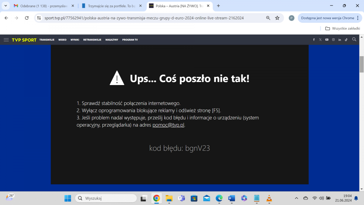 Galeria zdjęć z problemami technicznymi podczas transmisji meczów Euro 2024 przez Telewizję Polską. Widoczne plansze informujące o kłopotach z DDoS, sygnałem i atakiem hakerskim. Komentarze rozczarowanych internautów oraz deklaracje, że TVP wyciągnie wnioski. Mecze z Austrią i Holandią zatrzymane przez problemy z transmisją, podczas gdy użytkownicy oburzeni nieudolnością telewizji publicznej. Czy dostawca TVP Sport poprawi jakość przed meczem z Francją? Zobacz zdjęcia.