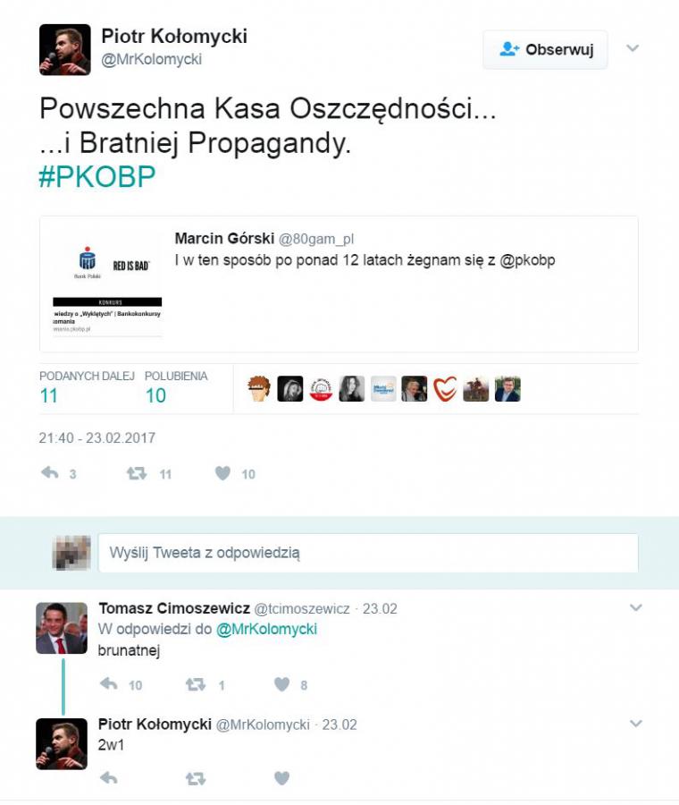 Krótko przed świętem, które upamiętniało Żołnierzy Wyklętych, bank PKO BP ogłosił konkurs wiedzy o nich. Podlaski parlamentarzysta – Tomasz Cimoszewicz nazwał to wydarzenie brunatną propagandą. To wygląda jak porównanie polskich żołnierzy walczących o niepodległość ze szturmowymi bojówkami NSDAP.