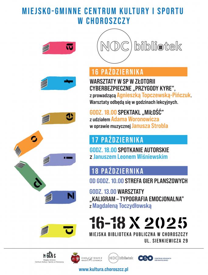 Zapraszamy na trzydniowe wydarzenie pełne inspiracji literackich, poezji i kreatywności. Pierwszy dzień rozpocznie się 16 października w Szkole Podstawowej w Złotorii, z warsztatami literackimi z Agnieszką Topczewską-Pińczuk. Wieczorem emocje sięgną zenitu podczas programu Miłość z udziałem Adama Woronowicza i Janusza Strobla, inspirowanego twórczością księdza Jana Twardowskiego. Drugi dzień, 17 października, to spotkanie z Januszem Leonem Wiśniewskim w Choroszczy, autorem bestsellerowej Samotności w sieci. Ostatni dzień, 18 października, dedykowany jest sztuce słowa i rozrywce z warsztatami artystycznymi i strefą gier planszowych. To idealna okazja dla miłośników literatury i kultury, by spędzić czas w inspirującej atmosferze podczas Nocy Bibliotek w Choroszczy. To wydarzenie pokazuje, że kultura może być fascynująca i dostępna dla każdego!