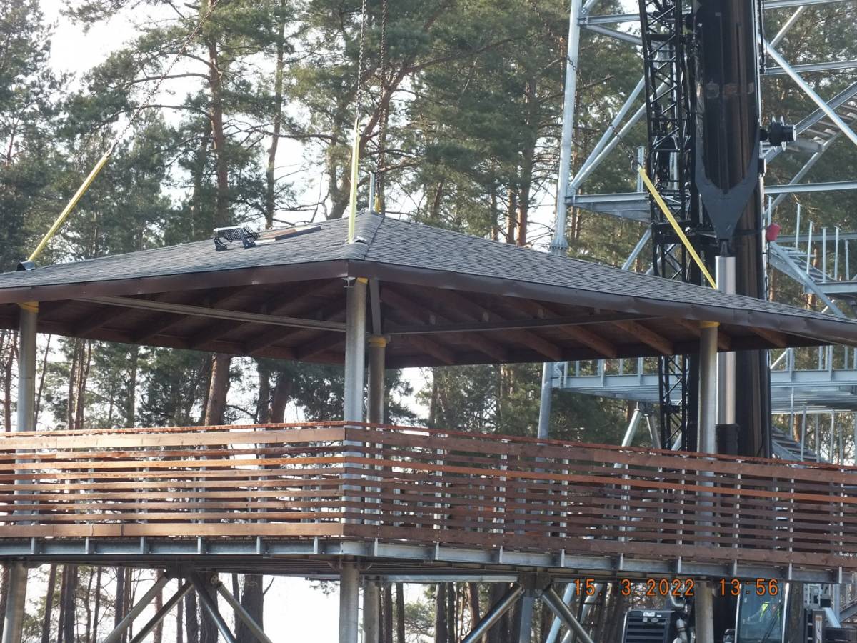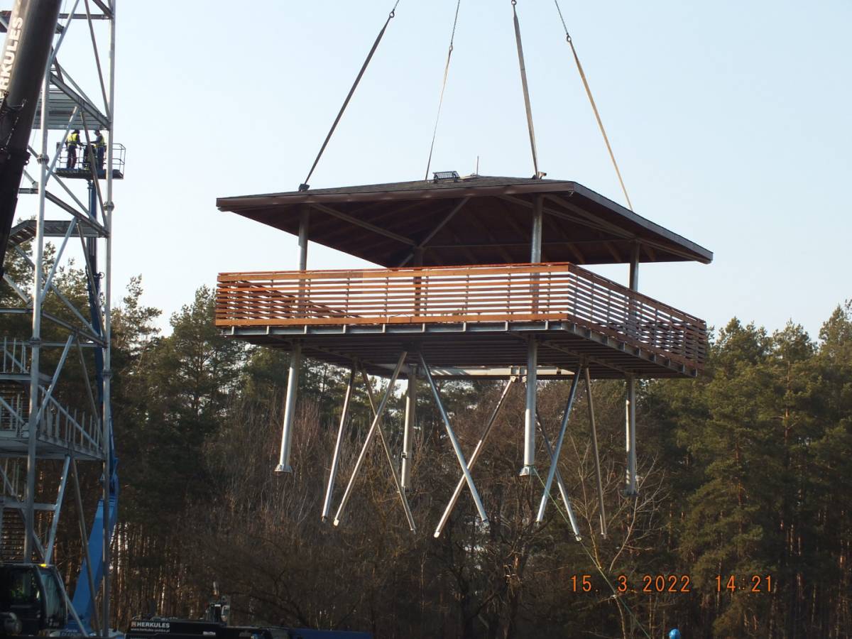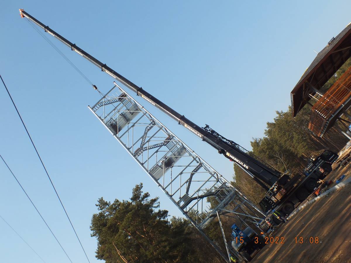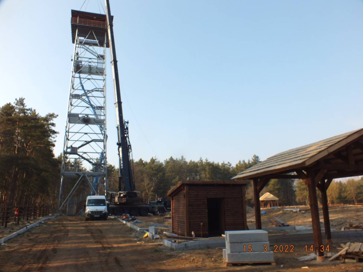 Na początku minionego tygodnia za pomocą specjalistycznego dźwigu ustawiono konstrukcję wieży widokowej w Uhowie. Wieża góruje nad lasem, bo jest od niego zdecydowanie wyższa.