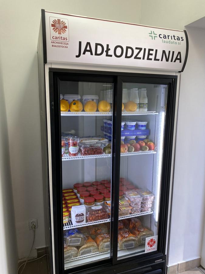 Galeria zdjęć przedstawia nowoczesną lodówkę pełną żywności, która jest dostępna dla wszystkich mieszkańców w centrum miasta. Inicjatywa jadłodzielnia, organizowana przez Caritas, daje możliwość dzielenia się nadmiarem żywności i pomocy potrzebującym. Te ujęcia obrazują sposób, w jaki społeczność lokalna angażuje się w walkę z marnowaniem jedzenia i wspiera osoby dotknięte niedostatkiem.