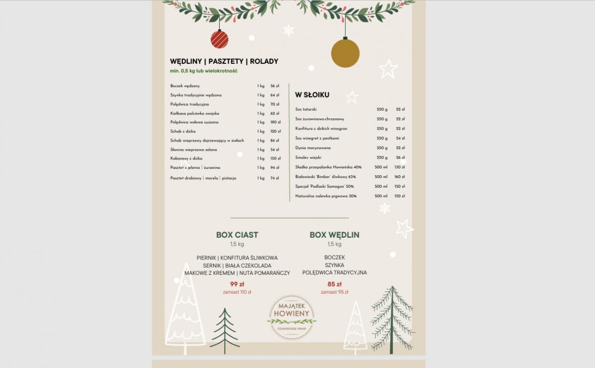 Regionalne smaki Podlasia na Boże Narodzenie - galeria zdjęć prezentująca wykwintne dania świąteczne oferowane przez popularne restauracje Białegostoku. Strefa Smaku, Villa Tradycja, Dworek Czarneckiego, Majątek Howieny i Folwark Nadawki prezentują tradycyjne wigilijne menu, bogate w klasyczne potrawy jak karp, pasztet czy pierogi, ale także nietypowe wariacje z dziczą, jeleniem czy sandaczem. Smakowite zupy, desery i wędliny robią wrażenie. Opcje dla każdego, kto ceni regionalne kulinarne tradycje na święta.